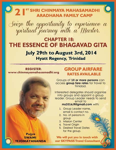 View upcoming events Add event21ST ANNUAL MAHASAMADHI ARADHANA FAMILY CAMP July 29th to August 3rd 2014. Circle the dates! Pujya Guruji, Swami Tejomayanandaji will be at our Trinidad centre for the 21ST ANNUAL MAHASAMADHI ARADHANA FAMILY CAMP. Relax...Reflect...Re-Energize! Come to the Caribbean for the first Mahasamadhi Aradhana Camp outside of North America. Take some time to explore and experience the wonders of the island and its distinctive potpourri of cultures. Then settle down to a week-long retreat with other Chinmaya Mission families and our CM Acharyas. Guruji will be taking Chapter 18 of Bhagavad Gita, and you will have the opportunity to experience satsang with other Acharyas too. Adults, Chyks and Bala Vihars each have a structured program. Seize the opportunity. Make it a summer to remember. July 29th to August 3rd 2014.