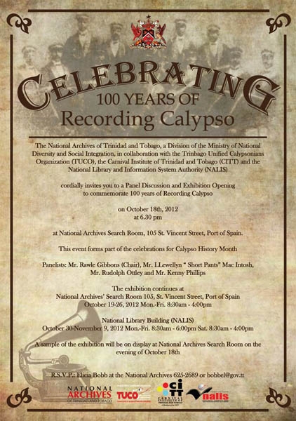 View upcoming events Add eventThe National Archives of Trinidad and Tobago, a Division of the Ministry of National Diversity and Social Integration, in collaboration with the Trinbago Unified Calypsonians Organization (TUCO), the Carnival Institute of Trinidad and Tobago (CITT) and the National Library & Information System Authority (NALIS) cordially invites you to a Panel Discussion and Exhibition Opening to commemmorate 100 years of recording Calypso. This event forms part of the celebrations for Calypso History Month. Panelists: Mr Rawle Gibbons (Chair), Mr Llewellyn "Short Pants" Mac Intosh, Mr Rudolph Ottley and Mr Kenny Phillips The exhibition continues at the National Archives Search Room until October 26th, Monday to Friday from 8:30am to 4:00pm NALIS POS, October 30th to November 9th, Monday to Friday from 8:30am to 4:00pm. A sample of the exhibition will be on display at the National Archives Search Room during the opening Please RSVP for the opening with Elicia Bobb at the National Archives