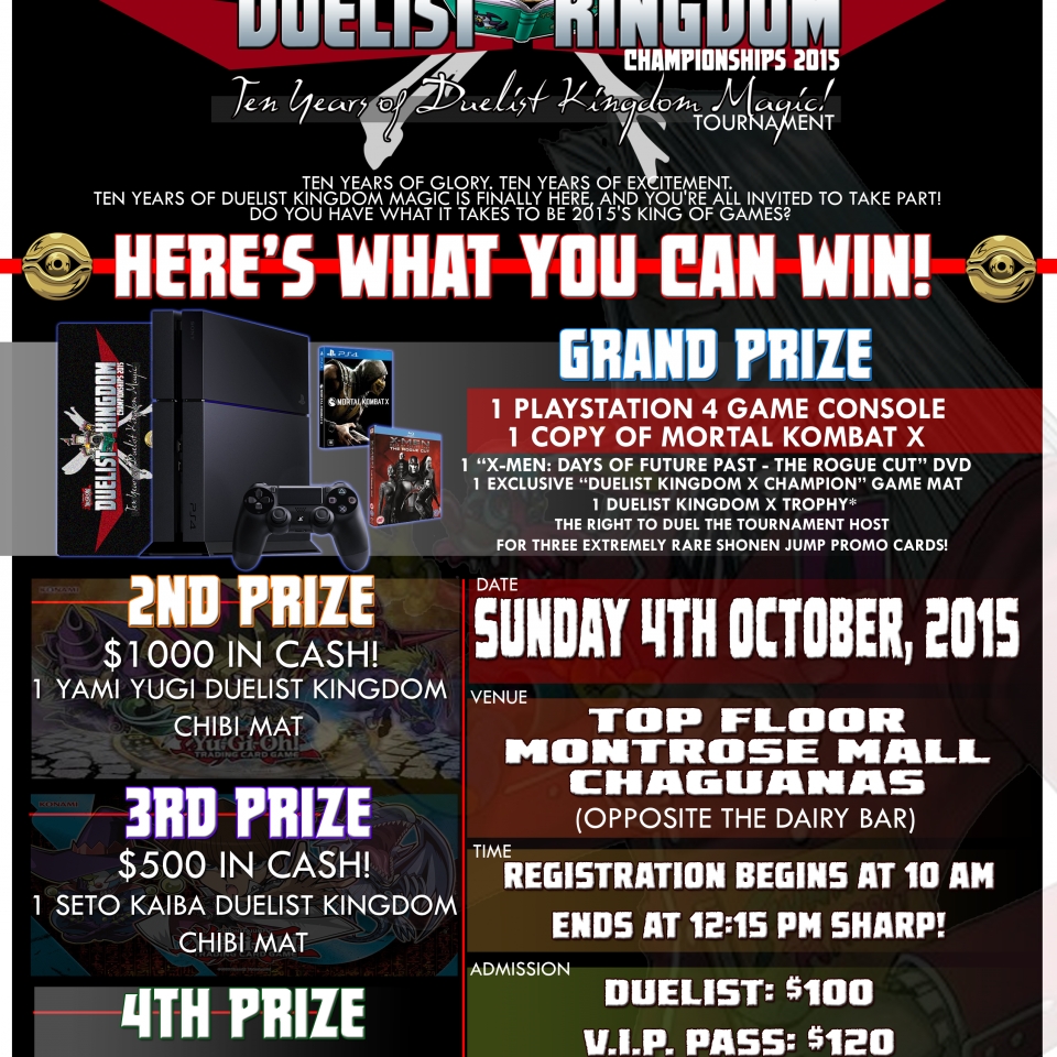 GRAND PRIZE: 1 Playstation 4 Console (includes 1 controller), 1 copy of Mortal Kombat X, 2 DvD movies (1 copy of X:Men - Days of Future Past, and 1 Copy of Avengers: Age of Ultron*), 1 Duelist Kingdom Championships 2015 Game Mat and your name engraved on the Duelist Kingdom Challenge Trophy, with your own replica copy to take home at a later date!