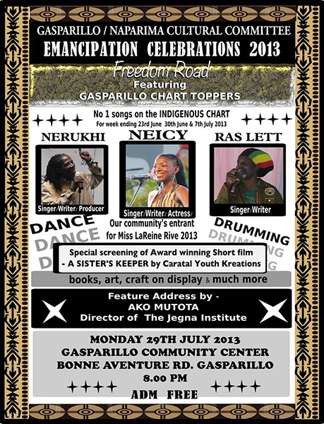 View upcoming events Add eventFREEDOM ROAD - Featuring the superlative talent of the community - Local Music chart toppers- NERUKHI, NEICY, RAS LETT, Drummers, Dancers, film screening, Books, and much more. FEATURE ADDRESS BY BRO AKO MUTOTA, Director - Jenga Institute. Adm free Venue- Gasparillo Community Center. Bonne Aventure Rd Gasparillo