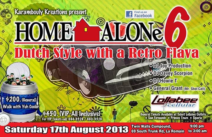 Karambouly Kreations It's Home Alone Time again!!! This year we're going Dutch Style with a Retro Flava!!! DJ Joy Production, DJ Davey Scorpion, DJ Howie T and General Grant $200 General. Walk with yuh cooler $450 VIP General Tickets available at Lollabee Cellular in Princes Town, Siparia and San Fernando. For VIP tickets, call 684-9328 or 680-9328.