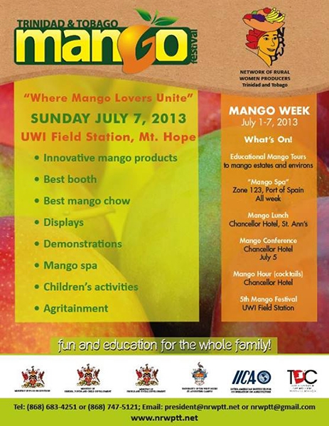 The Network of Rural Women Producers Trinidad and Tobago collaborates with UWI and the Ministry of Food Production to host the 5th Annual Mango Festival. This year’s event is carded for July 7th, 2013, from 9am-6pm, at the UWI Field Station, Mt. Hope. Sweet, juicy, versatile and delicious mangoes of every size and variety will be the focus of Trinidad and Tobago’s fourth annual Mango Festival. Featuring a mango market, mango products, grafting demonstrations, exhibitions, children’s activities, games, mango eating competitions and other entertainment, Trinidad and Tobago’s Mango Festival offers mango lovers every imaginable mango-made delight, from soaps and preserves, to candles and gift paper. A highlight of the Festival is the mango market where a variety of the locally grown fruit can be purchased, including the sinfully sweet Julie, considered the Queen of mangoes, which was developed in Trinidad, as well as other varieties with whimsical names such as Rose, Hog, Calabash, Douxdoux, La Brea Gyul, Turpentine, and Graham – a seedling of the Julie mango. Trinidad and Tobago’s Mango Festival promotes economic opportunities through the sustainable use of the mango and educates participants on the many benefits of the much loved fruit. Mango Week: July 1st to 7th What's on? . Educational Mango Tours to Mango Estates and environs . "Mango Spa" at Zone 123 Port of Spain All Week . Mango Lunch at the Chancellor Hotel, St. Ann's . Mango Conference at the Chancellor Hotel, St. Ann's on July 5th . Mango Hour (Cocktails) at the Chancellor Hotel, St. Ann's . 5th Mango Festival at UWI Field Station, Mount Hope